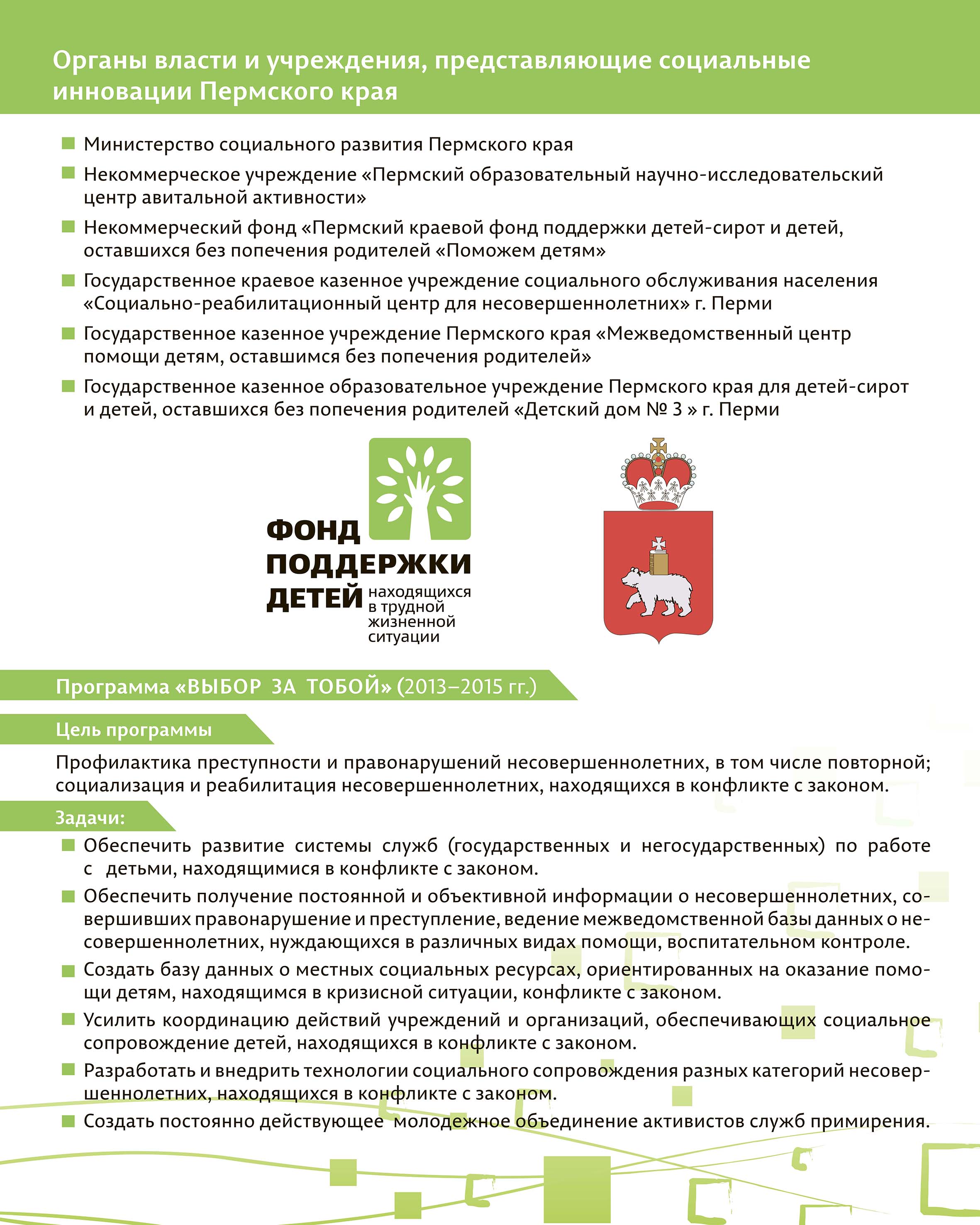 Краевой информационный портал «Восстановительные технологии в Пермском крае» функционирует в рамках Программы мероприятий Пермского края по профилактике, социализации и реабилитации несовершеннолетних, находящихся в конфликте с законом, на 2013-2015 годы «Выбор за тобой».